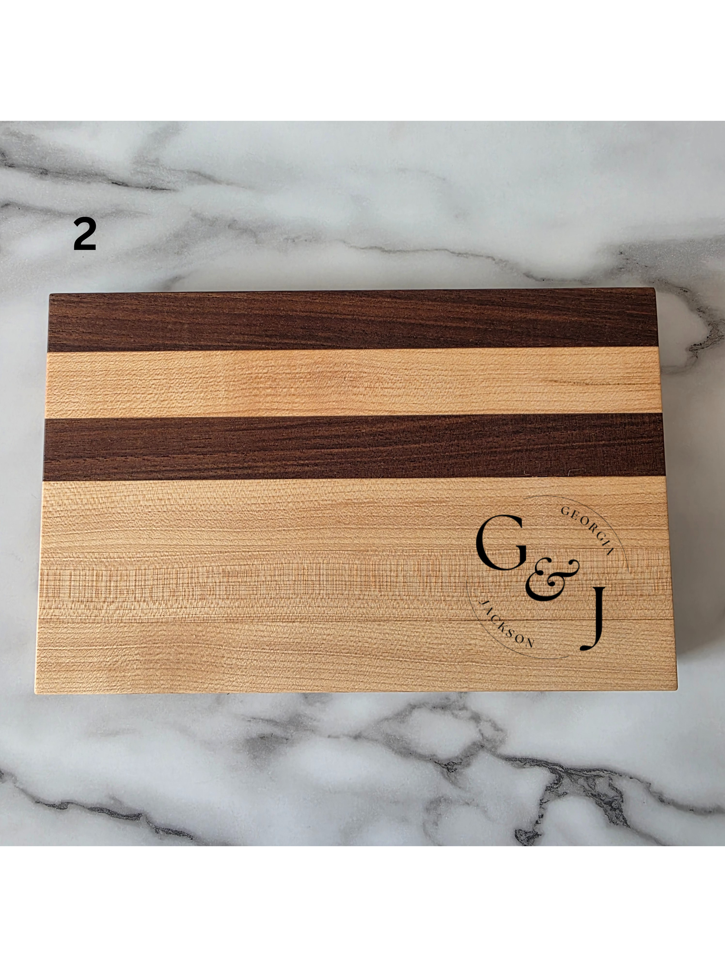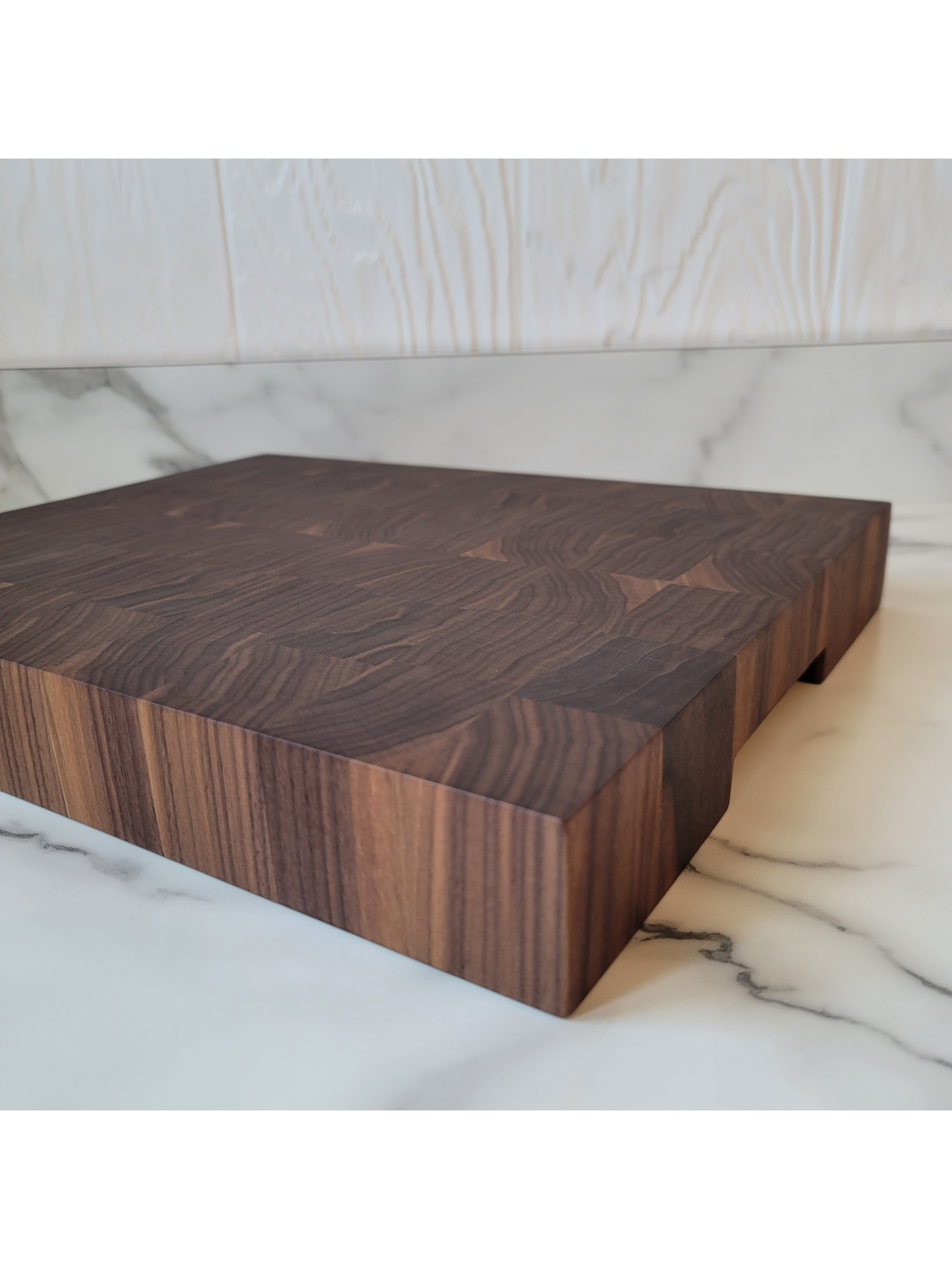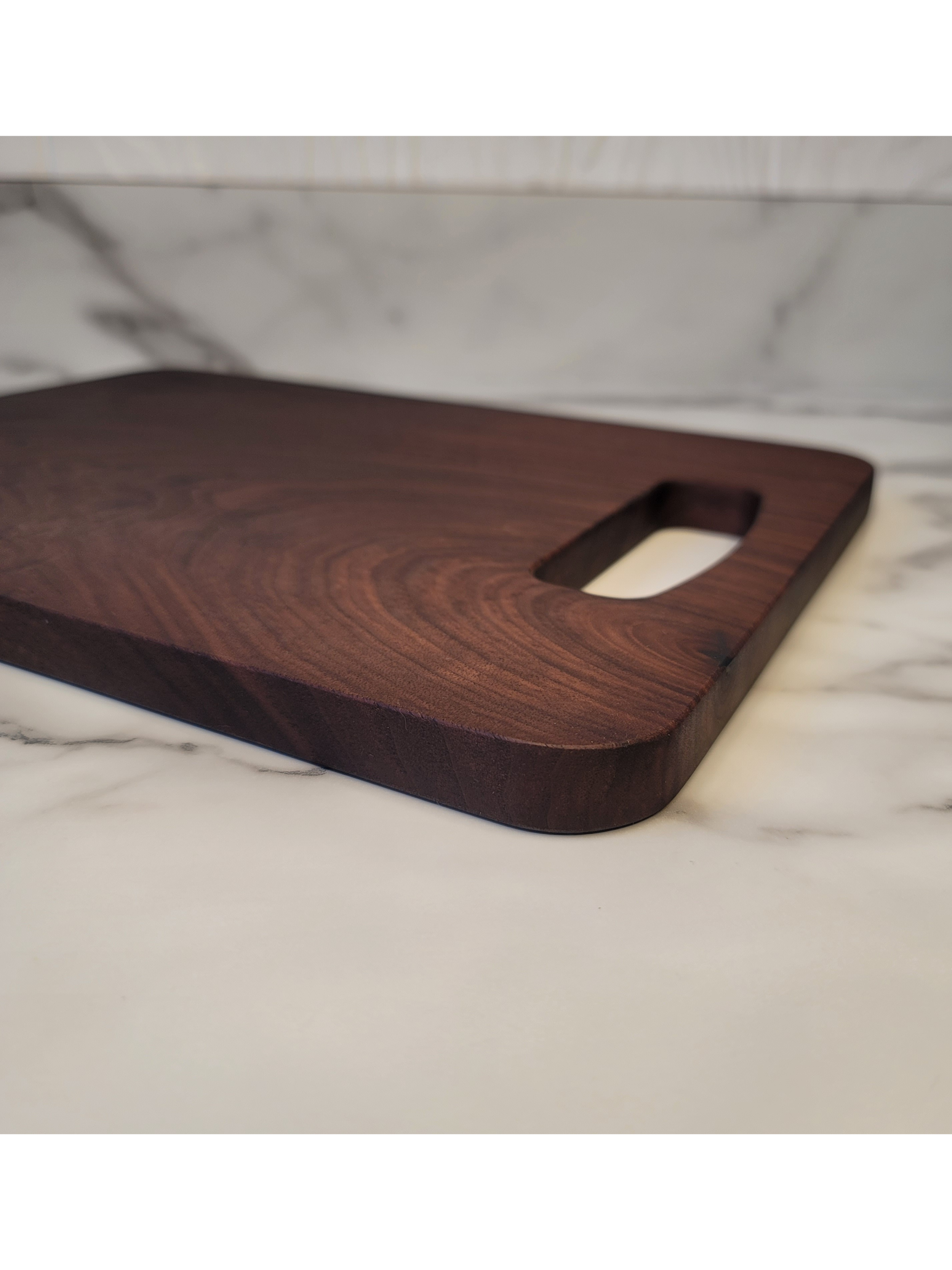 Walnut and Maple Edge Grain Cutting Board. 17.5 inches long by 11.25 inches wide and 1.75 inches thick. This board is finished with a food safe oil and has rubber cutting board feet.