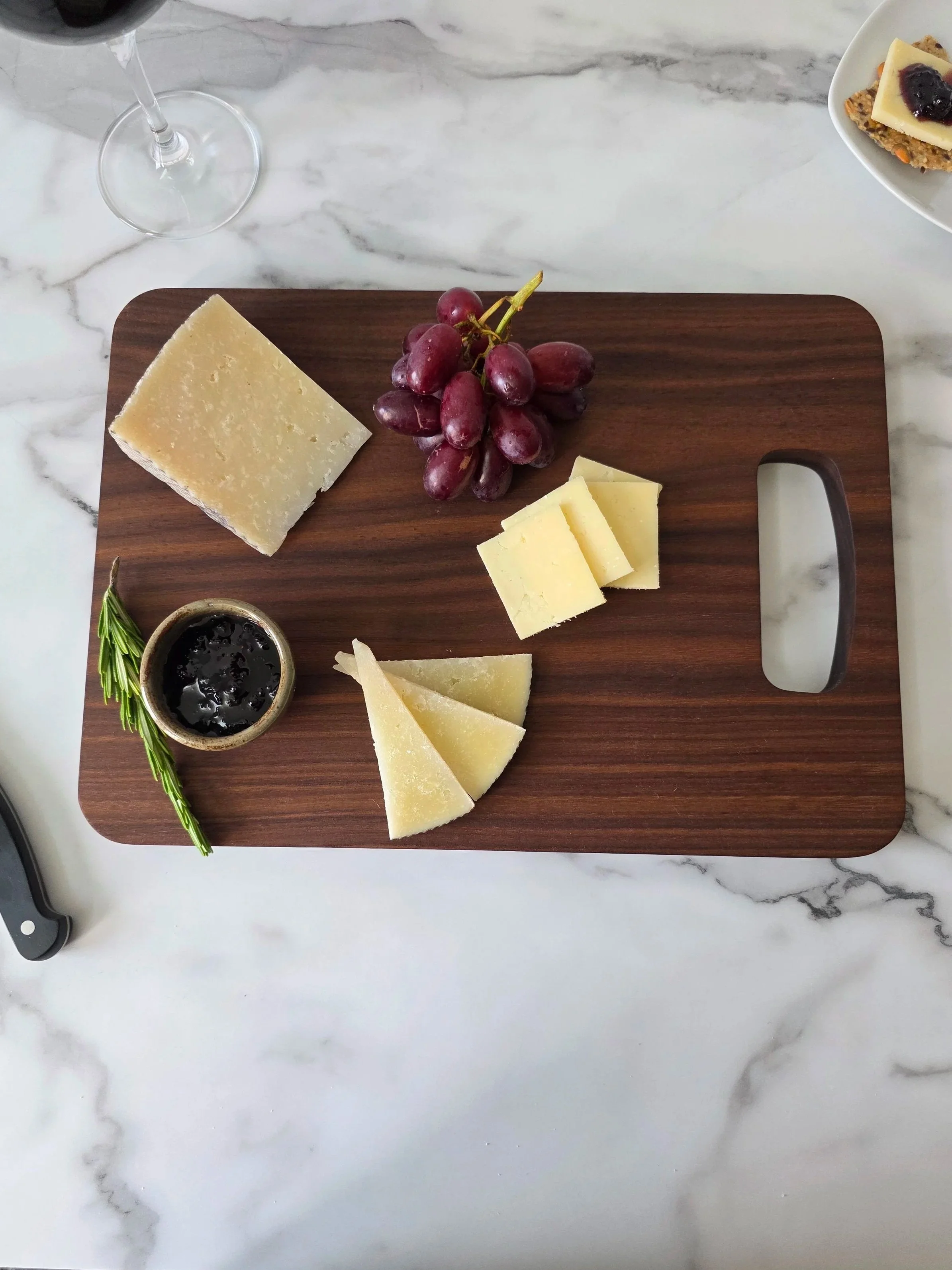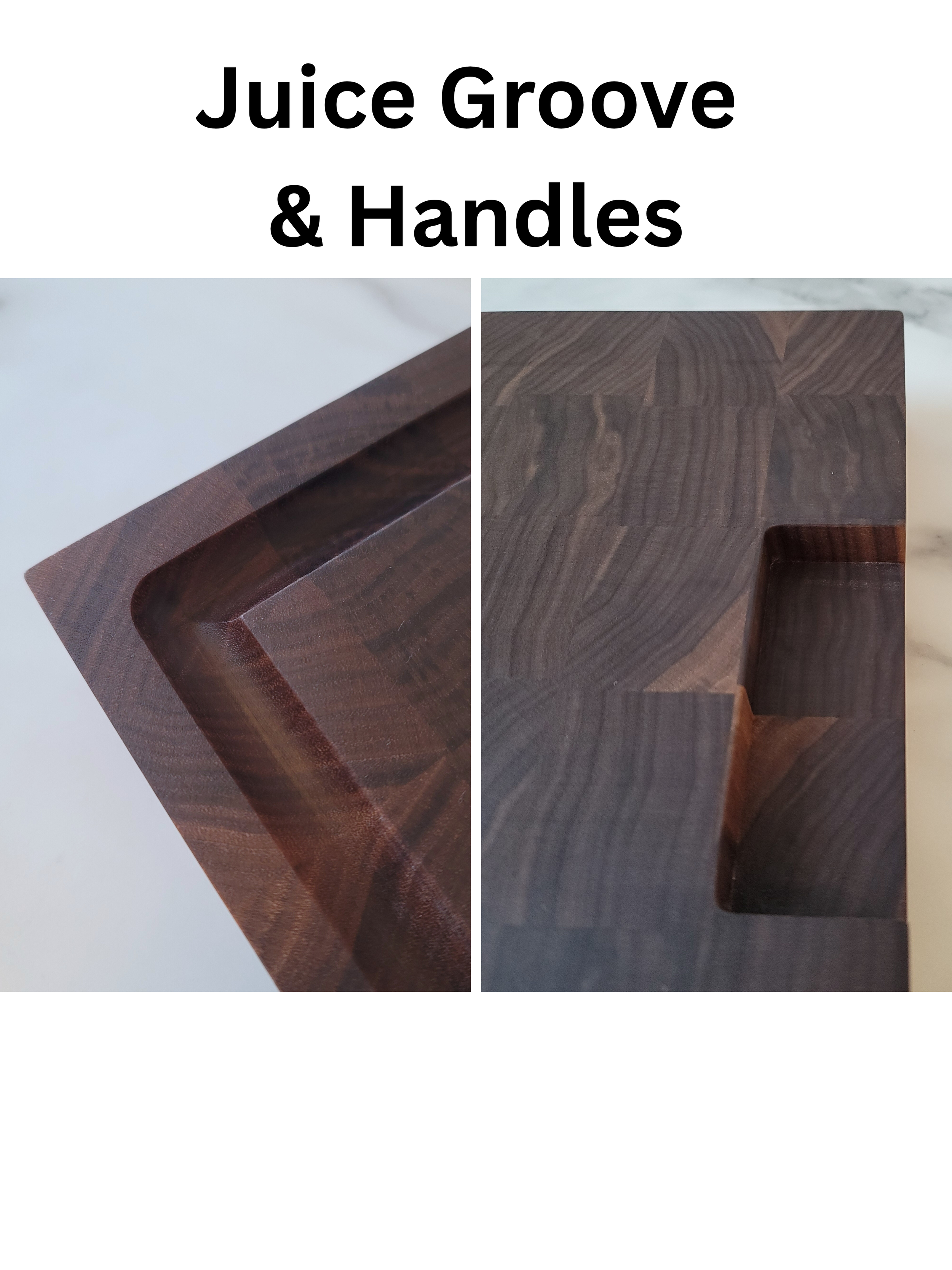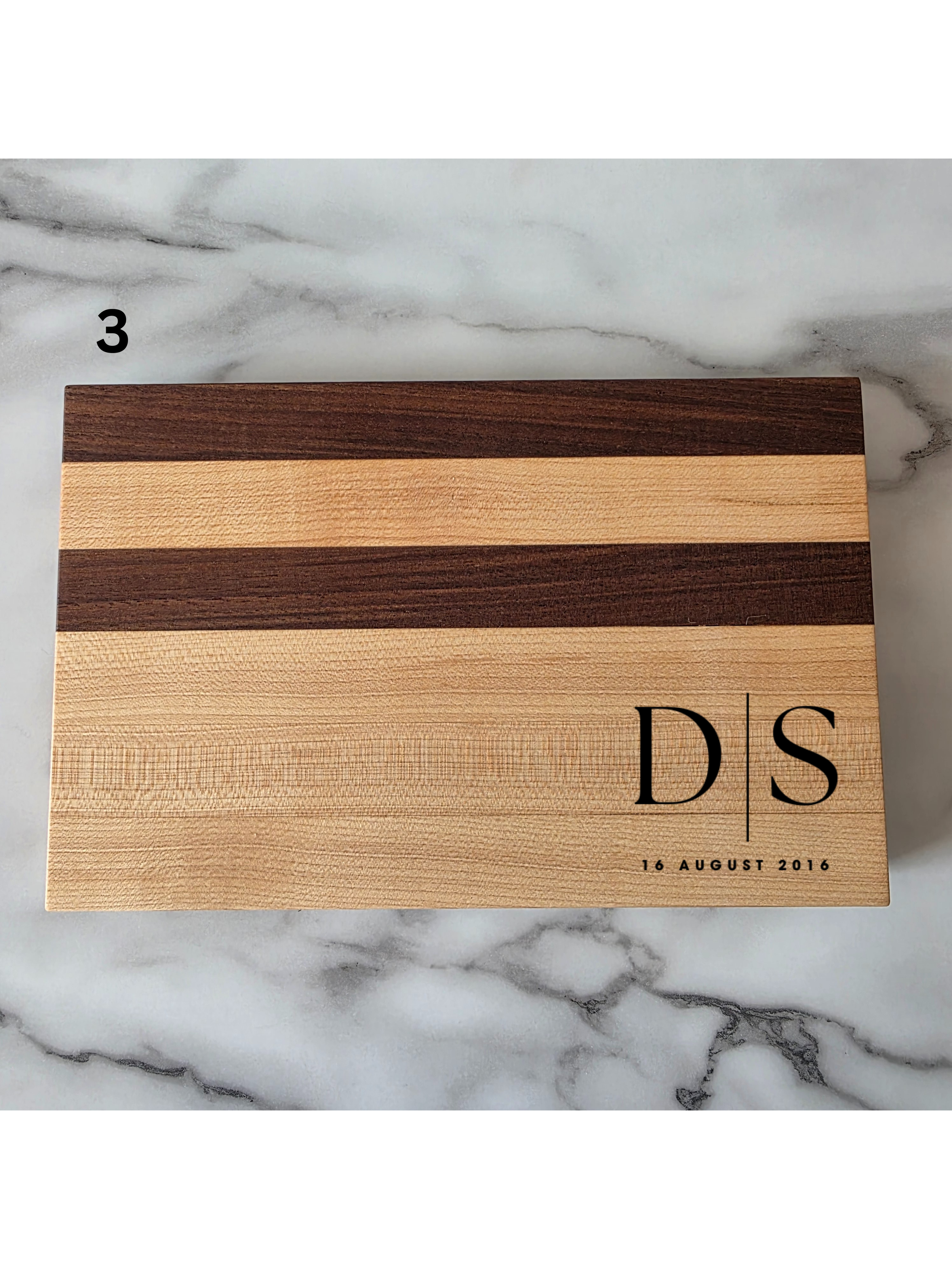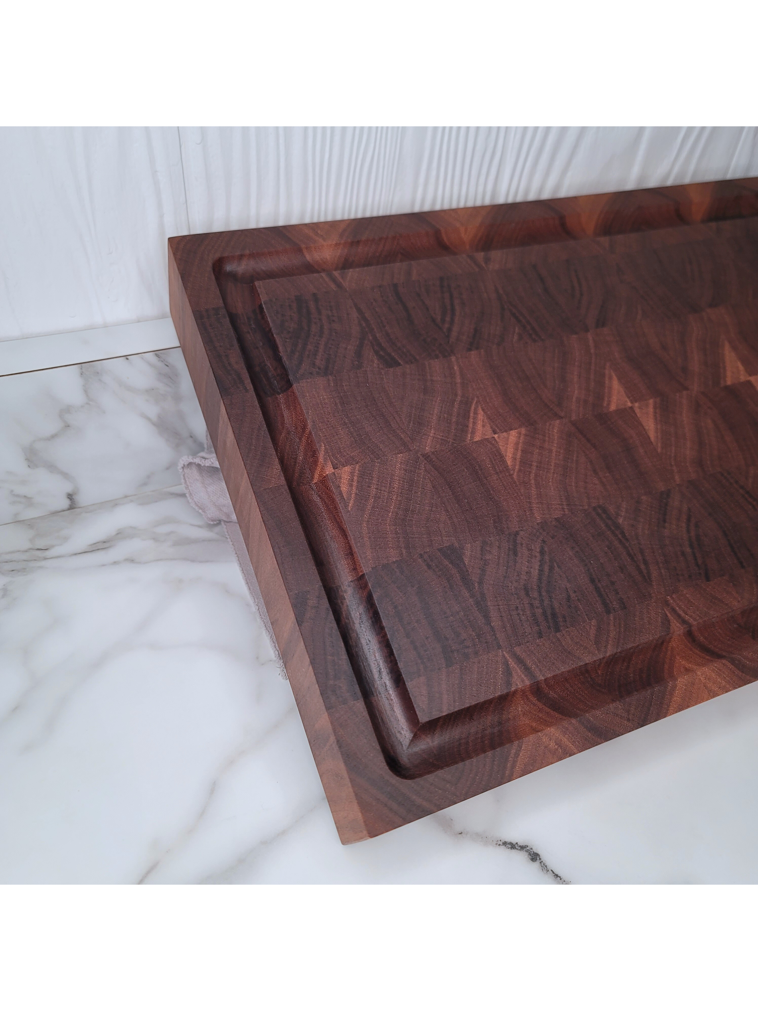 Walnut and Maple Edge Grain Cutting Board. 17.5 inches long by 11.25 inches wide and 1.75 inches thick. This board is finished with a food safe oil and has rubber cutting board feet.