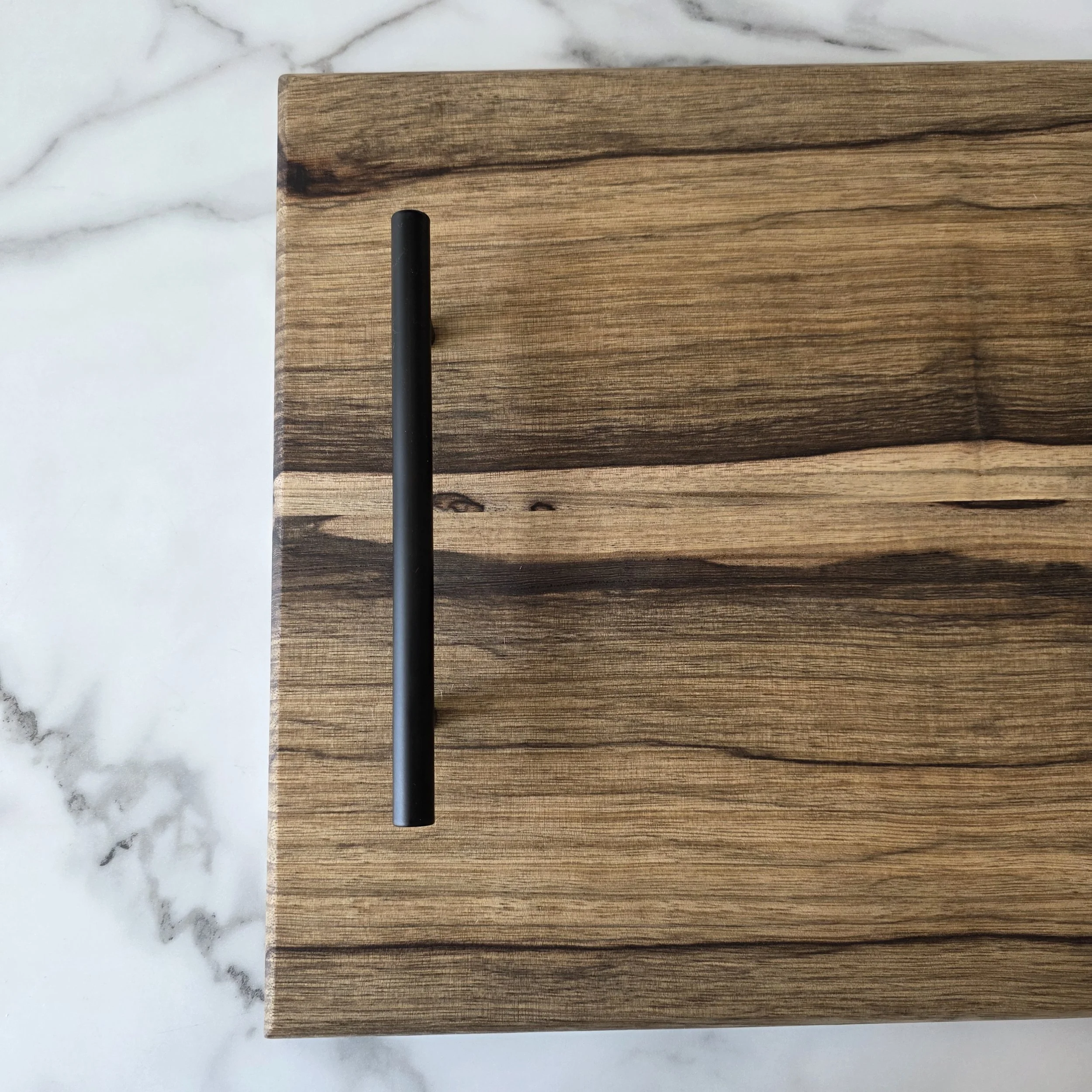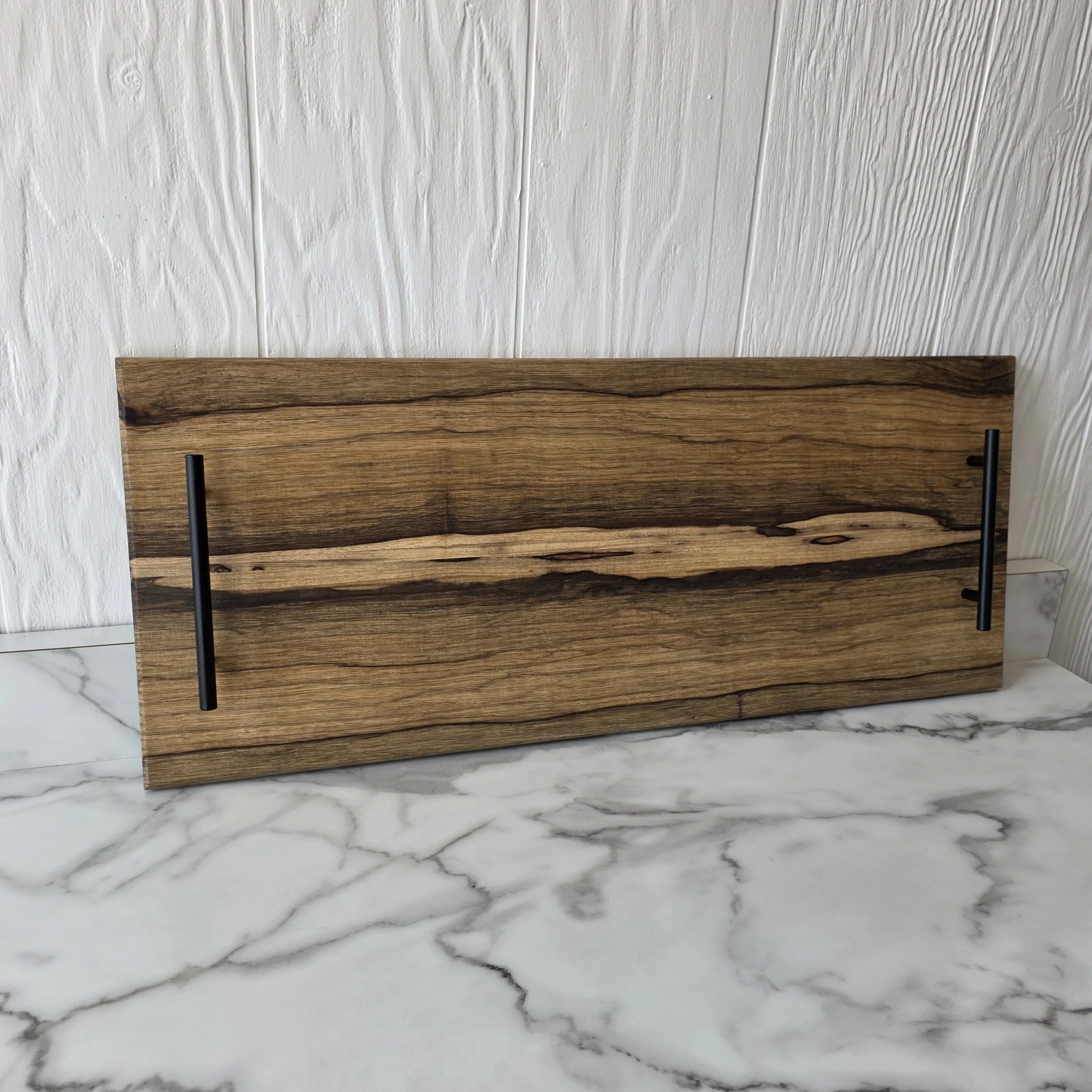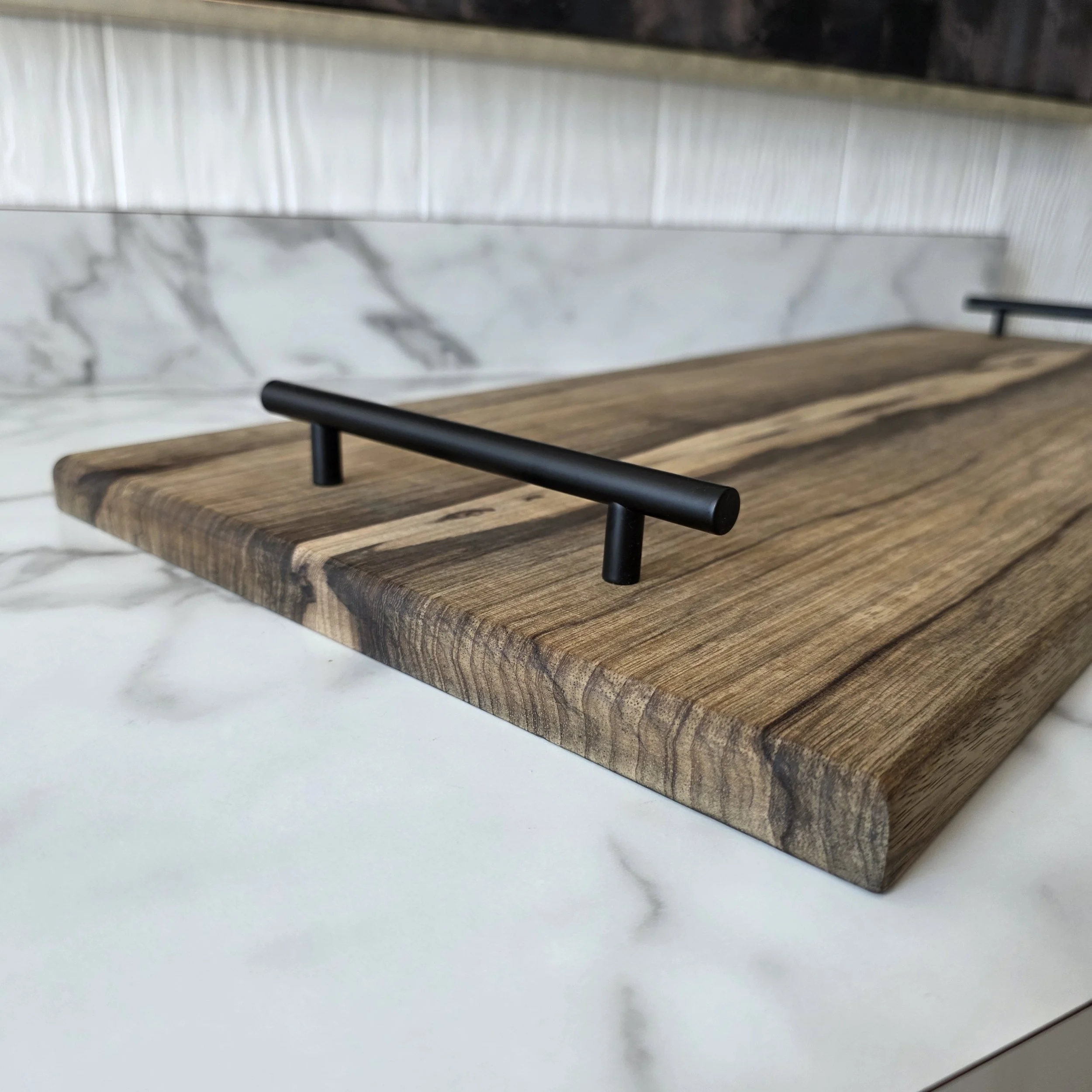 Serve in style with this handcrafted walnut serving tray, featuring sleek black handles for a modern touch. Made from rich walnut hardwood and finished with a food-safe oil, this tray is as functional as it is beautiful. Perfect for charcuterie, cocktails, or everyday entertaining.